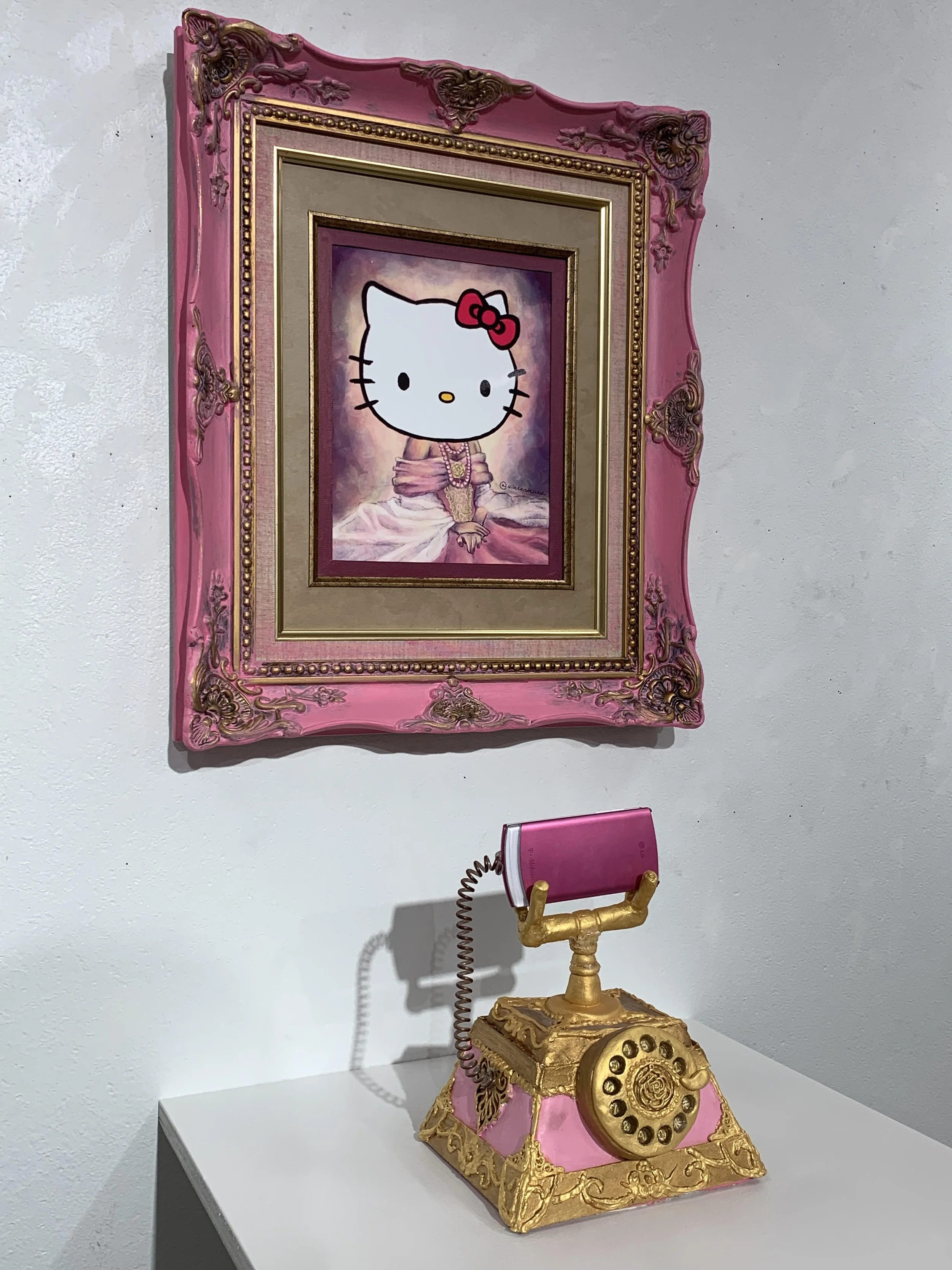 Obsession, 2022, vintage frame, digital print, flip phone, coil hair tie, foamboard, air dry clay, acrylic paint, wooden dowels