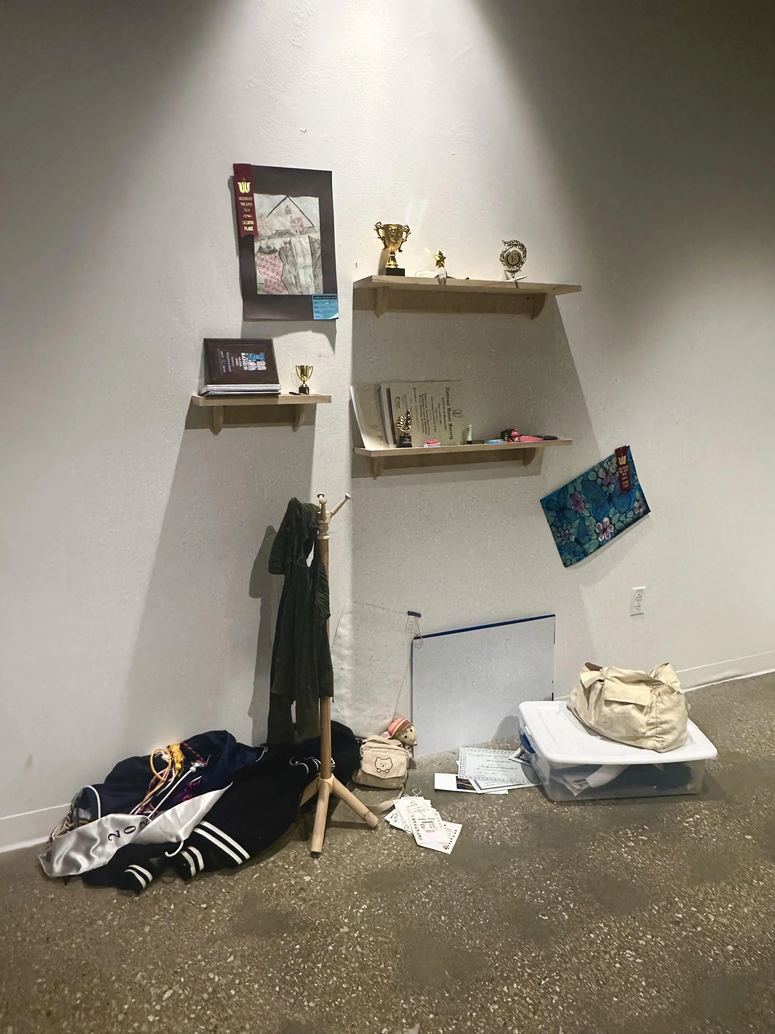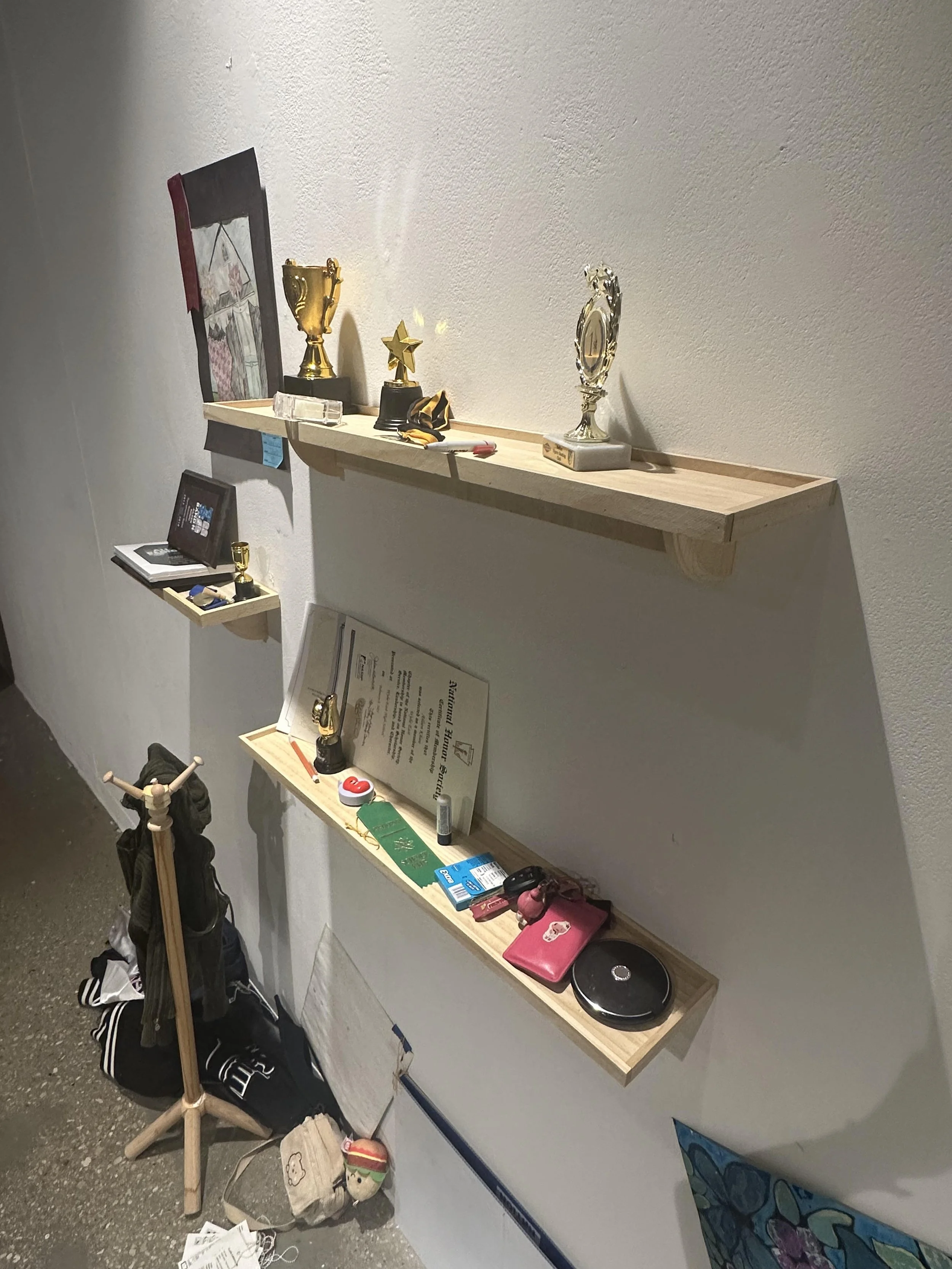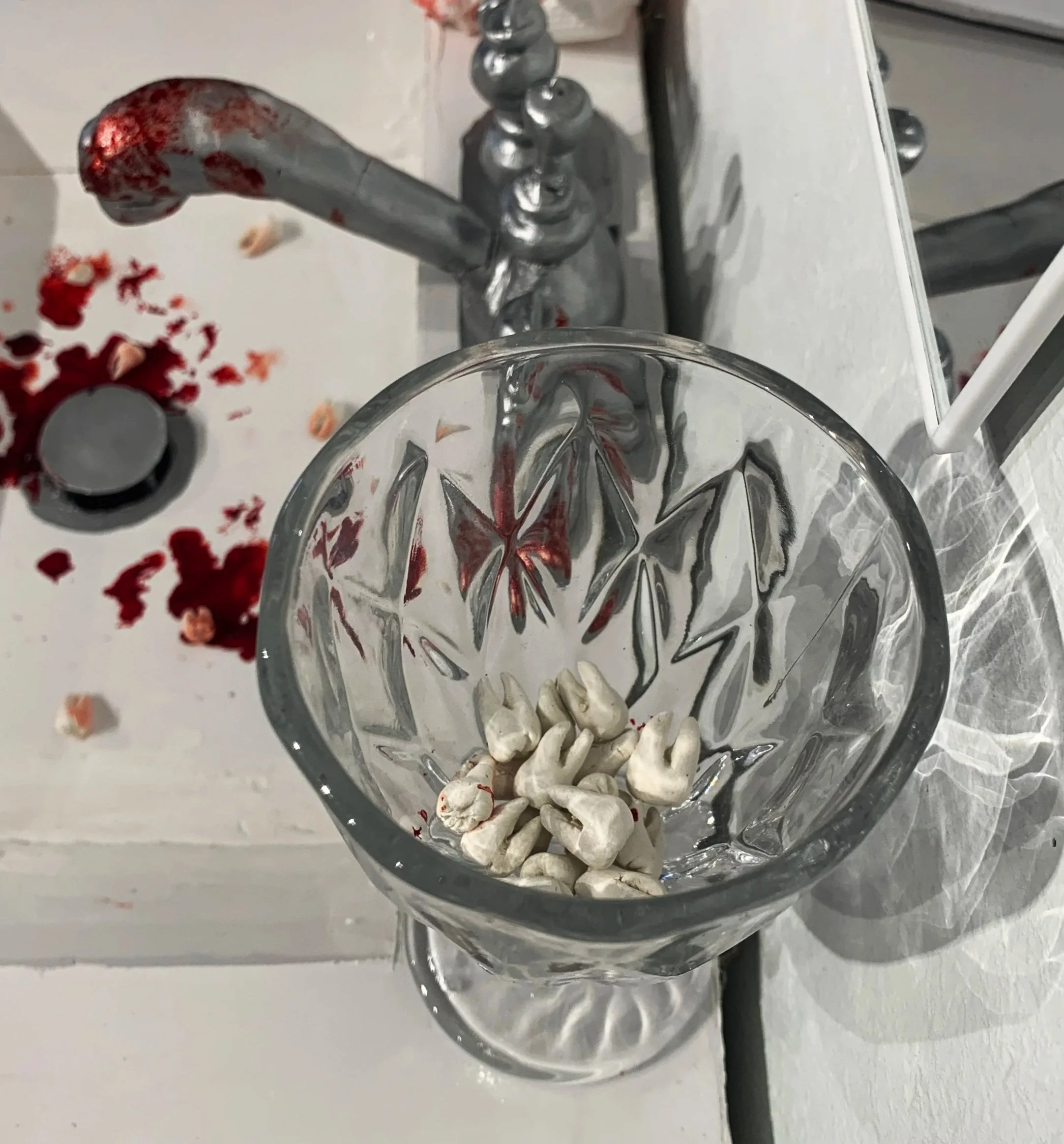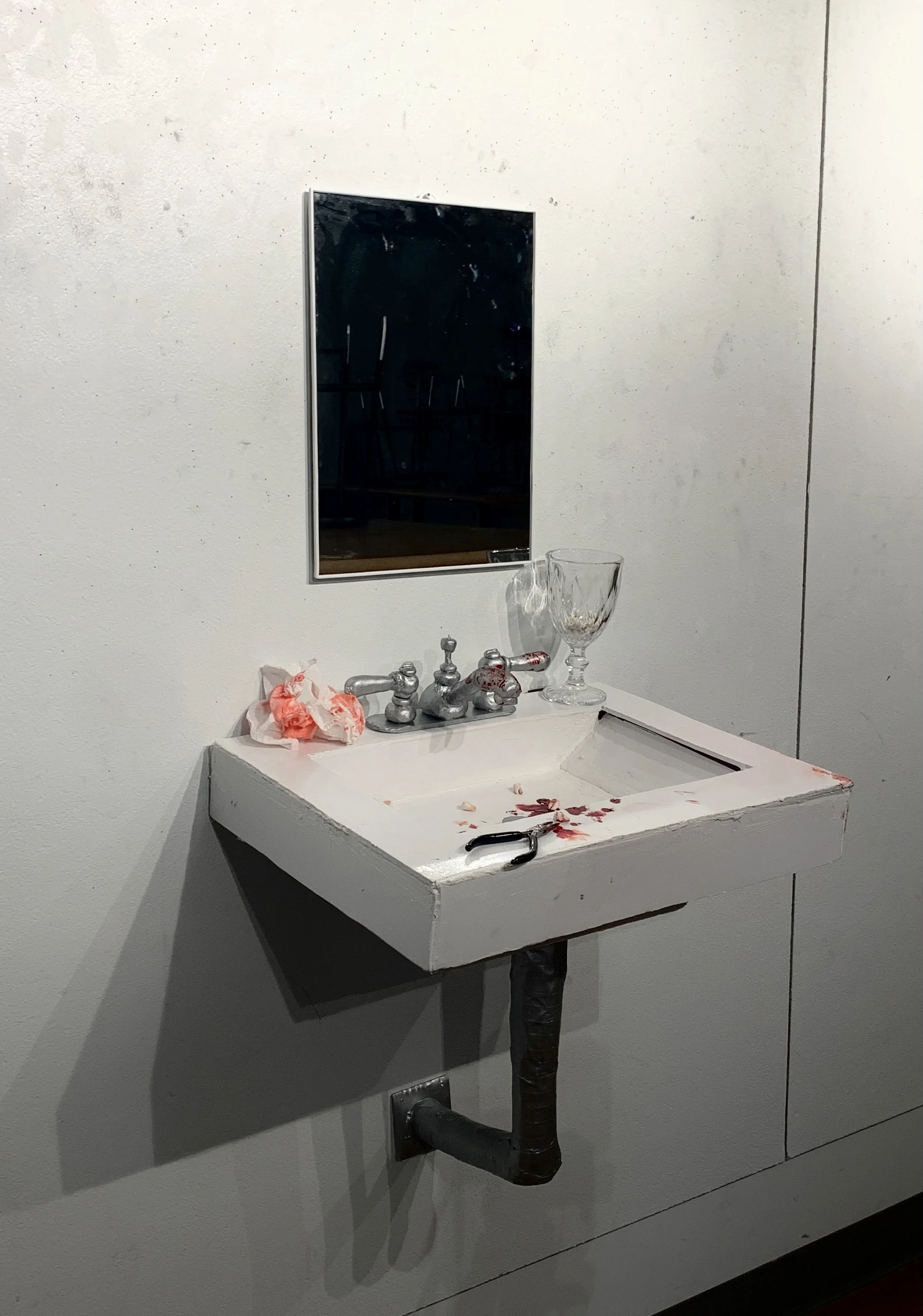 Smile, 2023, foamboard, clay, paper towel roll, artist tape, acrylic paint, napkin, mirror, glass cup, pliers, food coloring